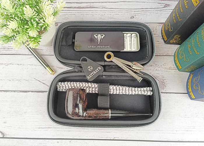 ไปป์ Rattray's คอลเลคชั่น Joy นี้ มาเป็นชุด ซึ่งทางแบรนด์จัดมาให้ครบ Set ไล่ไปตั้งแต่ไปป์ทรง Billiard ตรง ยอดนิยมแบบพื้นผิว Smooth ขัดมัน โทนสีน้ำตาลเข้ม ออกไปทางเทาๆ มี Mouthpiece ทำจากอะคริลิคสีดำตอกโลโก้แบรนด์ และวงแหวนโลหะสีเงินประดับ ที่ดูเรียบหรูสบายตา ฟิลเตอร์ 9 mm. ที่ใช้คู่กัน ตัวกดยา ลวดทำความสะอาดไปป์ และกระเป๋าใส่ไปป์ เหมาะกับคนที่ต้องการซื้อไปป์พร้อมสูบ หรือซื้อเป็นของขวัญของฝากสำหรับโอกาสพิเศษ เพราะได้รวมอุปกรณ์ที่จำเป็นไว้ในชุดทั้งหมดแล้ว