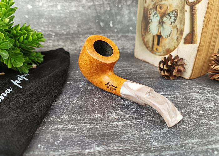 ไปป์ Molina Peppino Natural 134R 9mm ทำจากไม้ Briar คุณภาพดีจากอิตาลี ผิวสัมผัสแบบ Smooth และเคลือบเงาอ่อนๆ โชว์ลายไม้ธรรมชาติในราคาที่คุ้มค่าตามสไตล์ Molina ส่วน Mouthpiece ทำจาก อะคริลิคลวดลายสีขาวครีม น้ำตาล คล้ายหินอ่อน เพิ่มความสวยงาม มาพร้อมถุงผ้ากำมะหยี่สีดำ