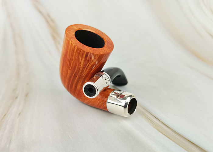 ไปป์ Peterson Natural Spigot 128 Fishtail รหัส PT-2591277 นับเป็นไปป์ที่น่าสนใจ เพราะเป็นเนื้อไม้แบบ Smooth Natural ใช้สีน้ำตาลอ่อน เพื่อเผยให้เห็นเส้นลาย Straight Grain ของไปป์ได้อย่างชัดเจน รวมไปถึงการใช้โลหะเงิน เป็นแหวนครอบบริเวณจุดเชื่อมต่อ ที่เรียกว่า spigot ช่วยเพิ่มความหรูหราขึ้นมาอีกระดับ ไปป์ชิ้นนี้ในกล่องมีผ้าเช็ดเงิน Silver Polishing Cloth ติดมาด้วย สำหรับทำความความสะอาดส่วนวงแหวนครอบที่เป็นเงิน เมื่อเกิดการเปลี่ยนสี