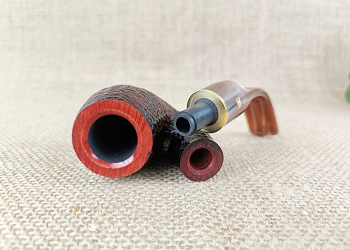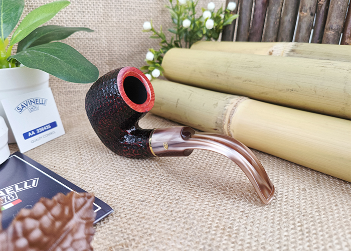 ไปป์ Savinelli Roma มีอยู่ด้วยกัน 2 แบบคือ Roma แบบธรรมดา คือมีเนื้อไม้ส่วนเบ้า ที่เป็นแบบผิวขรุขระ Rusticated โทนสีเข้ม ตัดกับ Mouthpiece สีดำ ส่วนรุ่นที่เห็นอยู่นี้คือ Savinelli Roma Lucite ซึ่งออกแบบให้ Mouthpiece เป็นสีโทนครีม น้ำตาล ไล่เฉดสี ประดับด้วยวงแหวนสีทองเล็กๆ และประทับตราตัวอักษร “R” สีทองซึ่งสื่อถึงคำว่า “Rome” ซึ่งเป็นแรงบันดาลใจในการออกแบบ